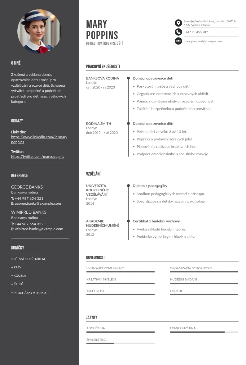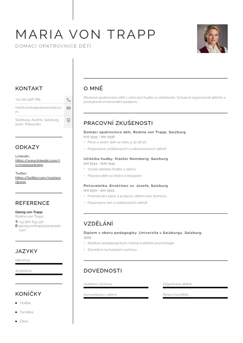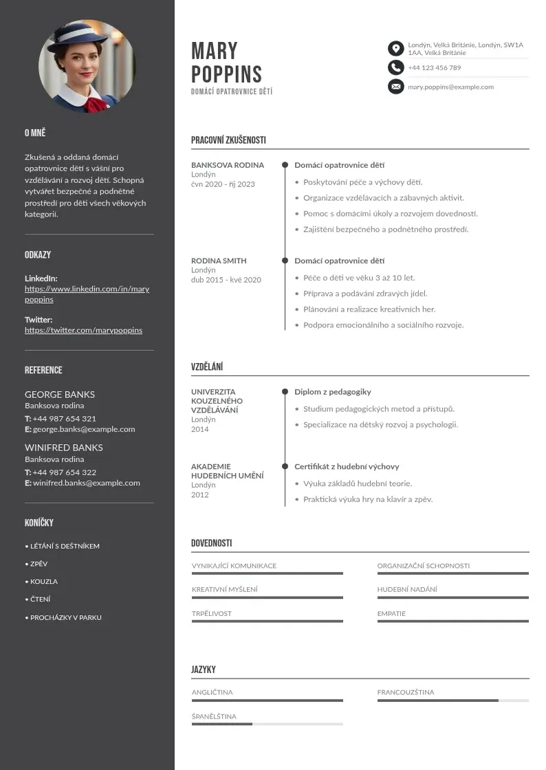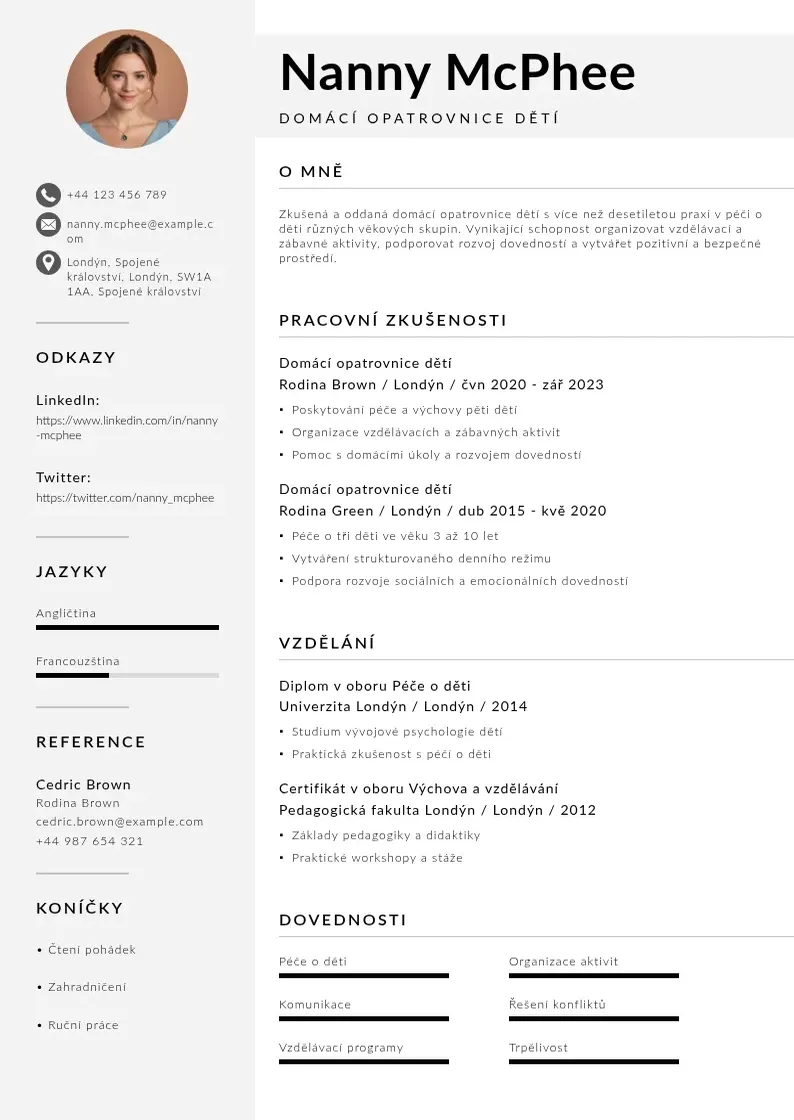 Inspirujte se s námi pomocí níže uvedeného příkladu. Další ukázkové příklady jsme si pro vás přichystali na našich stránkách. Jsou vám volně k dispozici, a nechybí ani životopisy v oblasti péče o děti, nebo hlídání dětí.
