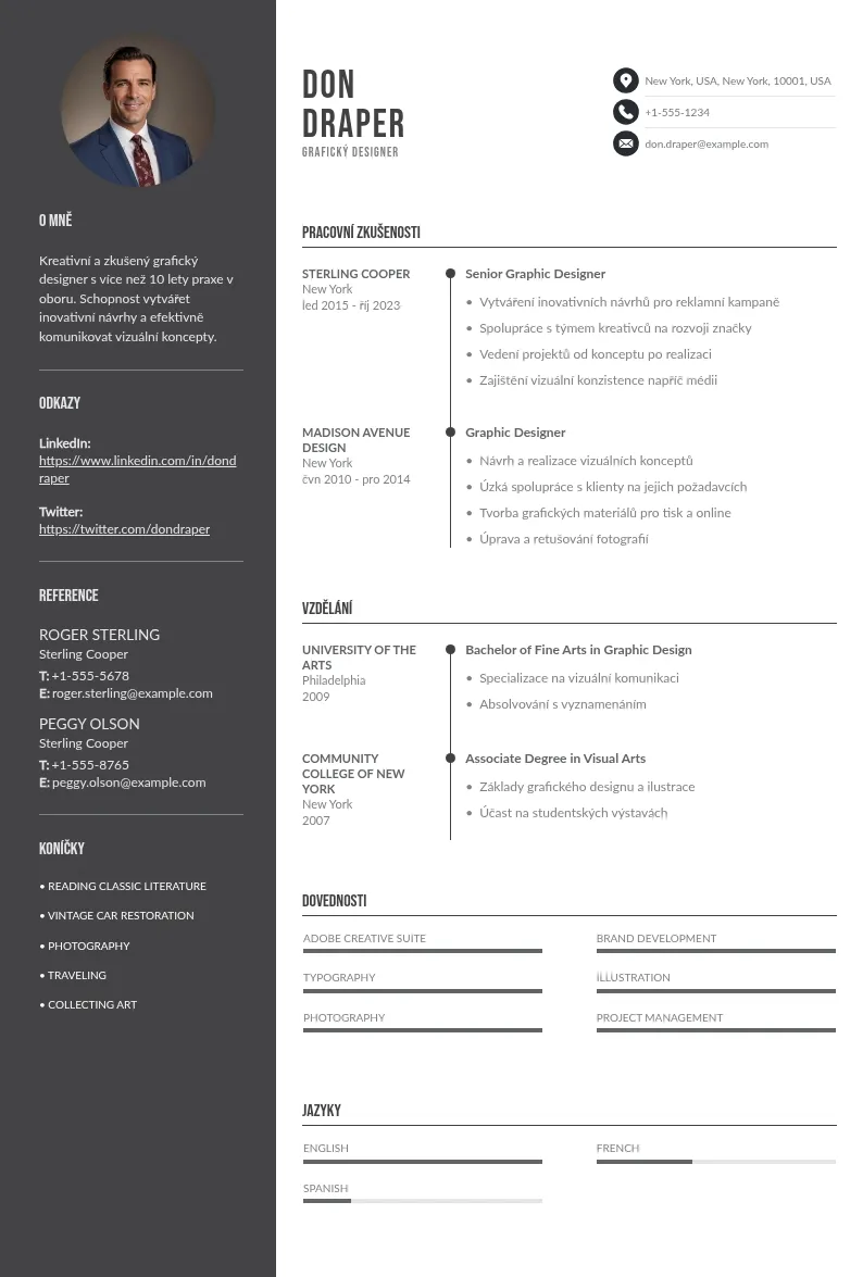 Konkrétně si ukážeme:Pojďme do psaní životopisu skočit rovnýma nohama, a to vzorovým příkladem, který vám může posloužit jako vodítko při tvorbě vlastního CVčka zkušeného grafického designéra. Další příklady životopisů podle oboru naleznete na našich stránkách!
