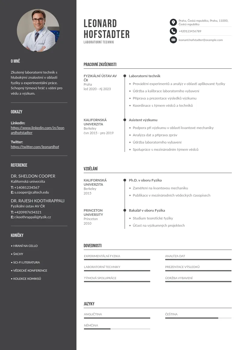 Jste talentovaný laboratorní technik s dlouholetými zkušenostmi s prováděním laboratorních testů a analýzou výsledků, ale zdá se, že se vám do životopisu nevejdou všechny vaše úspěchy? Získejte několik nápadů z našich inspirativních příkladů životopisu laboratorního technika a profesionálních tipů pro vytvoření nejlepšího CVčka pro danou laboratorní práci.
