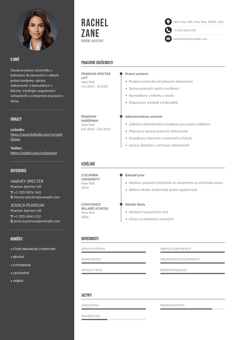 Životopis je pro vás jako pro právního asistenta první příležitostí, jak potenciálním zaměstnavatelům představit své dovednosti a zkušenosti. Zaměstnavatelé hledají odborníky, kteří zvládnou různé úkoly, od právního výzkumu po přípravu právních dokumentů, a kteří mají velký smysl pro detail a organizační schopnosti.