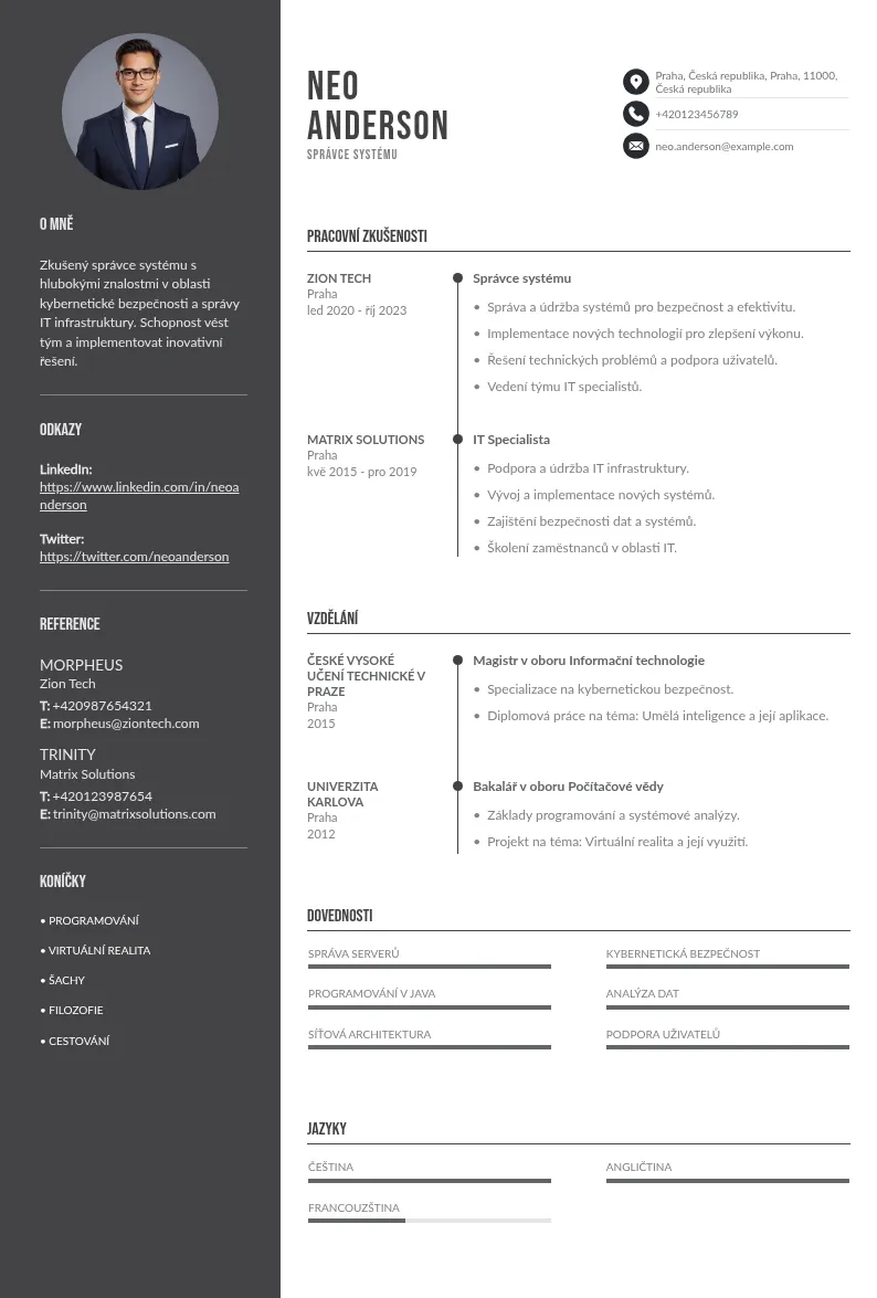 Prokažte své solidní zkušenosti se správou různých systémů, od Linuxu po Microsoft Windows, a své schopnosti ve skriptovacích jazycích, jako je Python. Ukažte svůj talent pro řešení problémů na reálných příkladech, jak změnit chaos v pořádek. Váš životopis správce systému bude klíčem, který vám otevře dveře k vysněné práci!