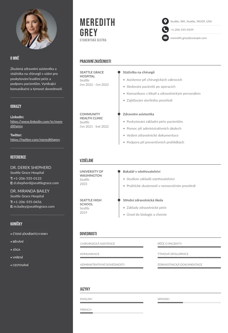 Podívejte se na náš kompletní příklad životopisu, abyste mohli vytvořit přesvědčivý životopis začínající zdravotní sestry i bez dlouhé profesní historie. Na našich webových stránkách naleznete řadu dalších příkladů CVček podle oboru , přičemž nechybí ani zdravotnický obor!