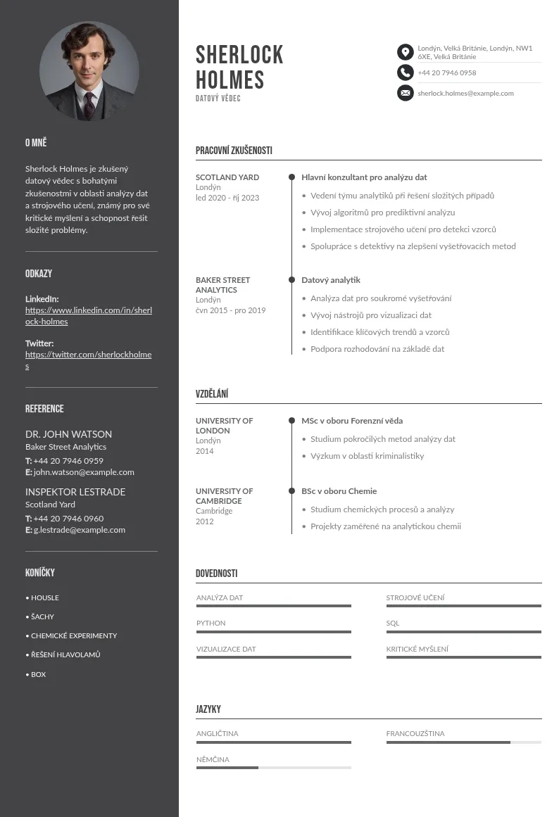 Šablona životopisu datového vědce je skvělou volbou pro uchazeče o zaměstnání. Zjednodušuje proces psaní životopisu, protože má hotový a jedinečný design. Nejlepší šablona pro životopis datového vědce by měla být dobře naformátovaná a atraktivní, s rozložením životopisu přijatelným podle průmyslových standardů.