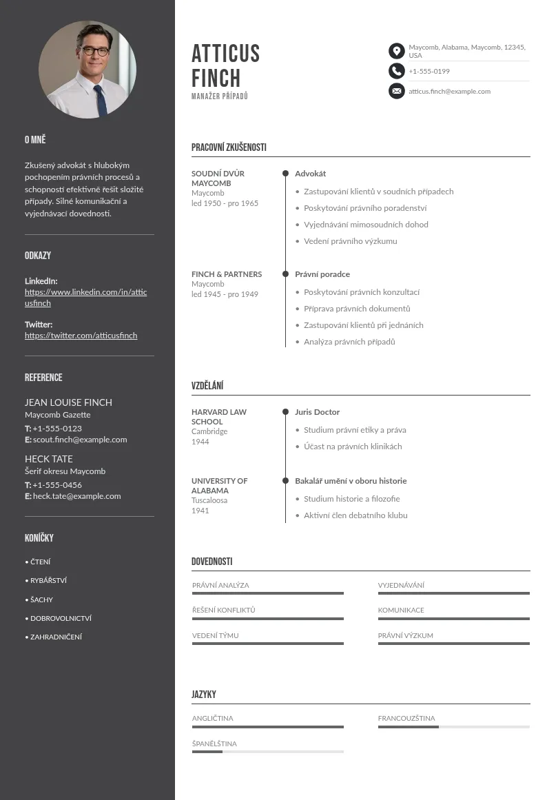 Fotografie v záhlaví vašeho životopisu není povinností, ale vhodně zvolený portrét může být užitečný. Osobnost případového manažera je důležitá a dobrý snímek dokáže zachytit, že jste tím správným člověkem pro tuto práci. Měli byste působit přístupně, příjemně, ale současně profesionálně a jako silná osobnost. Pořízení takového snímku není snadné, zvažte proto spolupráci s profesionálním fotografem.