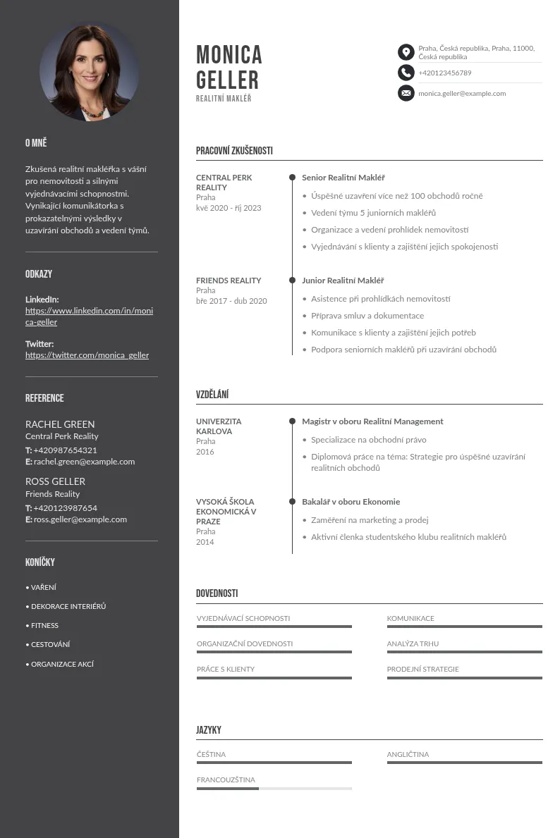 V následujícím podrobném průvodci psaním CV realitního makléře si názorně ukážeme:Níže naleznete vzorový příklad realitního makléře , kterým se můžete inspirovat při vytváření vlastního CVčka. Zabýváte se prodejem jiných aktiv, než jsou nemovitosti? Přečtěte si našeho podrobného průvodce psaním životopisu prodejce . Další příklady životopisů podle oboru jsou k dispozici na našem webu.