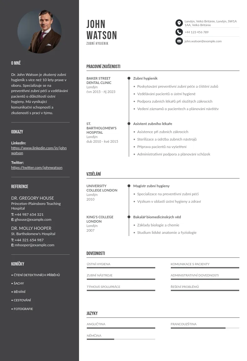 Níže uvádíme vzorový příklad zubního hygienika, kterým se můžete inspirovat při vytváření vlastního životopisu. Životopis zubaře a další příklady životopisů podle oboru naleznete na našich stránkách.