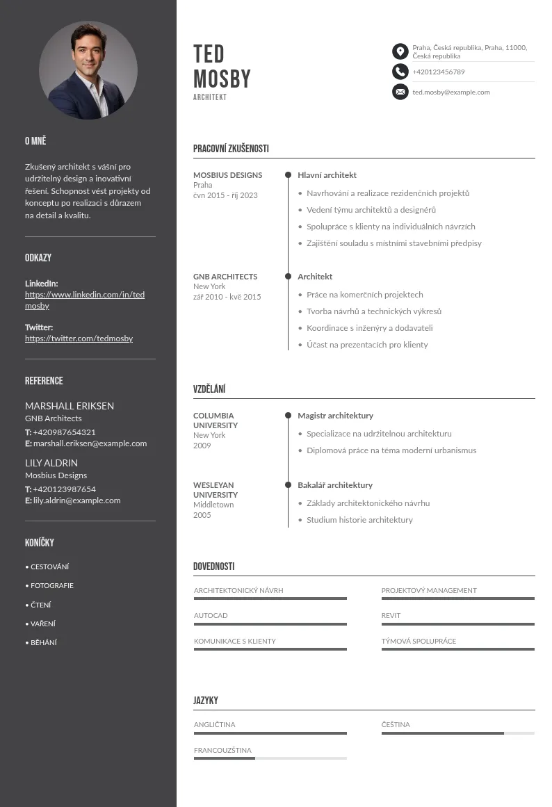 Pro získání práce v architektuře potřebujete kvalitní životopis, který vás bude odlišovat od ostatních uchazečů. Je to jednodušší, než si myslíte. Přečtěte si, jak napsat životopis architekta, aby se s vámi lidé chtěli osobně setkat na pracovním pohovoru. Podívejme se nejprve na vzorový životopis architekta, kterým se můžete inspirovat při přípravě svého vlastního. Později najdete také příklady vhodné pro začátečníky. Pro další inspiraci se podívejte na naši platformu , kde najdete řadu šablon životopisů a inspirace.