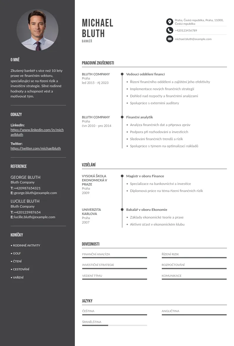 V následujícím průvodci psaním životopisu bankéře si konkrétně ukážeme:Pojďme do psaní životopisu bankéře skočit rovnýma nohama! Níže naleznete kompletní příklad CV bankéře , kterým se můžete inspirovat při tvorbě vlastního životopisu. Další příklady životopisů podle oboru naleznete na našich stránkách.