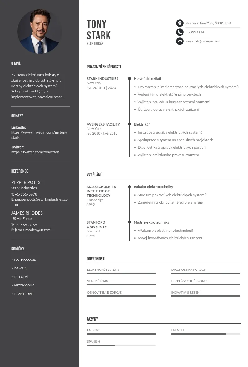 Životopis uveďte dobře navrženým záhlavím s osobními údaji (jméno, pozice, kontaktní údaje). Následuje profil, ve kterém stručně shrnete své dovednosti, zkušenosti a další kvalifikaci pro práci elektrikáře.