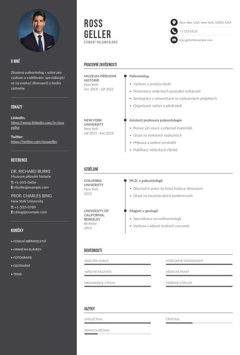 Vzor životopisu pro studenty vám ušetří čas a poskytne vám představu o struktuře tohoto dokumentu. Získejte personalizovaný životopis, který vám pomůže přesvědčit náboráře a uspět na pohovoru. Použijte náš online nástroj pro tvorbu životopisů a získejte přístup k široké škále šablon životopisů. Jednoduše si vyberte ten vzor životopisu, který nejlépe vyhovuje vašemu profilu, a upravte si ho podle libosti na tomto odkazu.